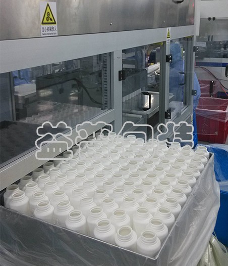 產品由進瓶輸送線送入排瓶推移工位,排瓶推移機構將整排推入排瓶臺。達到設定的行列數時,抱夾升降平移機械手將整層瓶抱夾裝入周轉箱中的塑料袋內。裝滿設定的層數后,人工將套好袋的空周轉箱推入裝袋工位,同時滿箱將推至取出工位,工人完成封口后將滿袋取出。并重新套上空袋。周轉箱套袋、滿袋封口及從周轉箱取出由人工完成,只需一人操作。